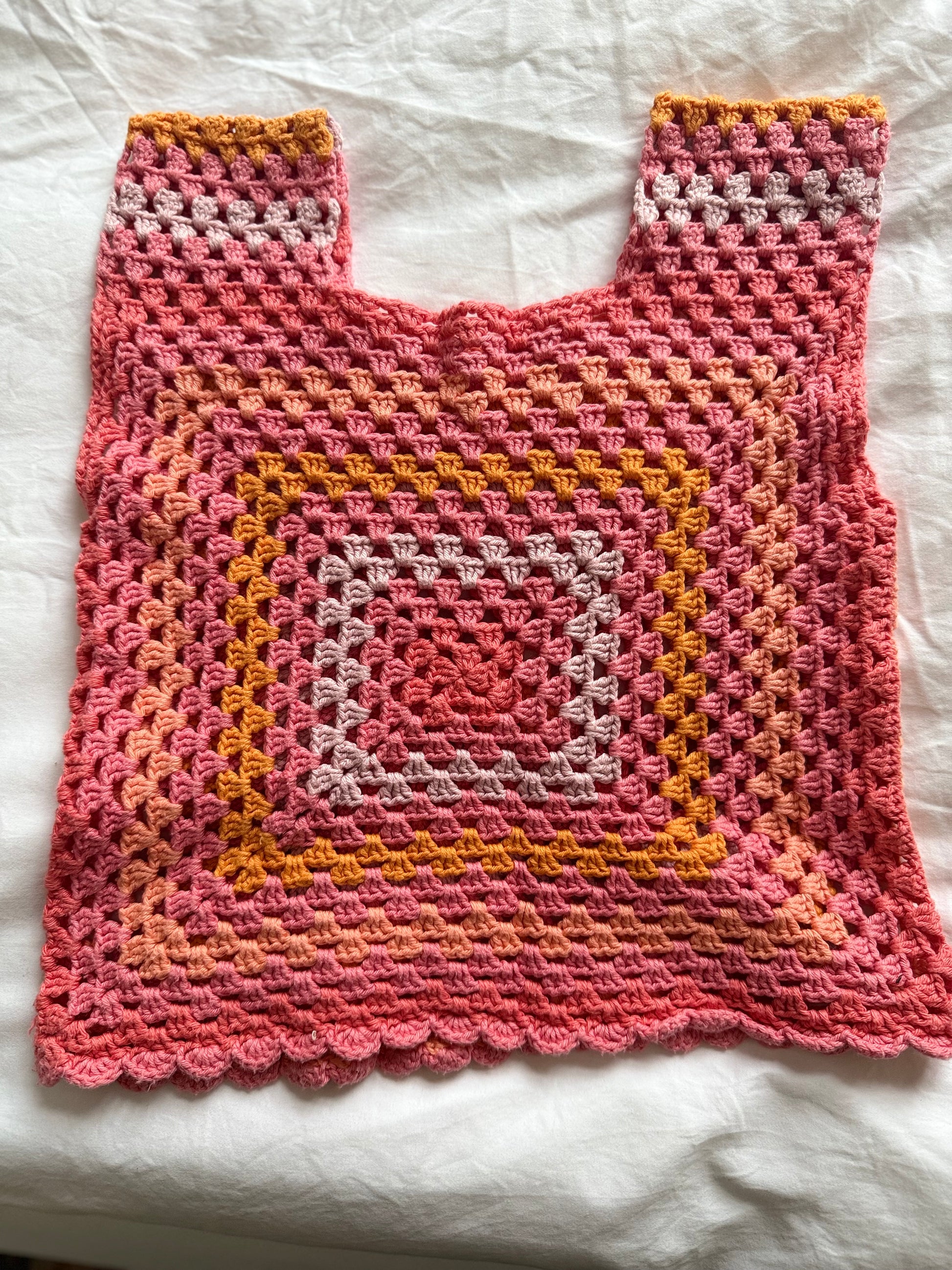 64cm i omkreds. (Jeg passer den og har et brystmål på ca 86cm) den giver sig. 38cm lang.